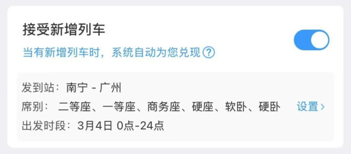 例:小王原筹画于3月1日从南宁赶赴广州,理念念车次车票已售罄,于是他添加了当日6趟列车候补购票,并勾选通盘席位和出行时段,将采纳范畴扩至最大,同期勾选“摄取新增列车”选项,将截止达成时候设为“开车前6小时”。终末,在开车前10小时把握车票生效达成。