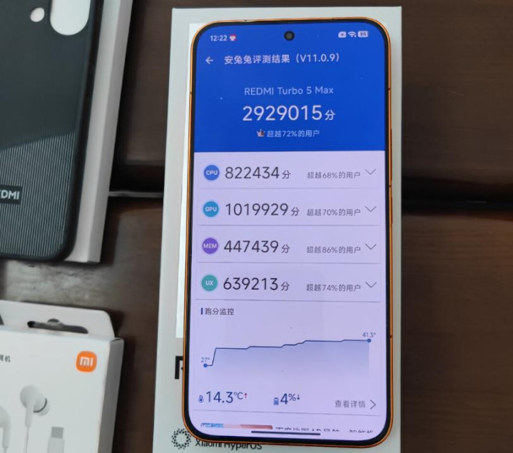 先说最中枢的体验,性能。许多东说念主买千元机,最怕的不是设置表不顺眼,而是用起来卡、玩游戏掉帧、两三个月后就初始发烧掉速。红米Turbo 5 Max此次首发天玑9500S,单看名字可能有东说念主还没太大要念,但看实测数据就明显了,安兔兔跑分径直冲到292万,这个得益放在千元档如实依然有点“离谱”了。