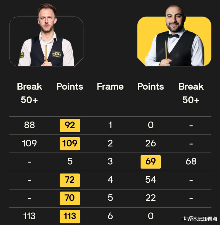 第二局,瓦菲领先拿到26分后失实,随后特鲁姆普单杆打出109分以109:26再胜一局2-0跳跃瓦菲。第三局,瓦菲凭借单杆打出68分的进展以69:5扳回一局1-2过期特鲁姆普。