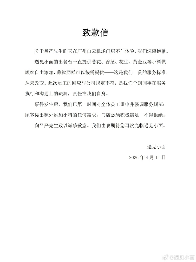 4月11日,碰见小面发布致歉信称,就吕严昨天在广州白云机场门店欠安体验,深感对不起。
