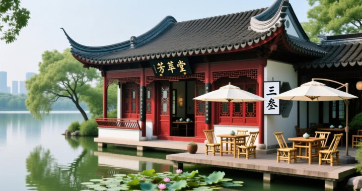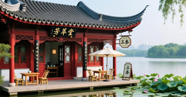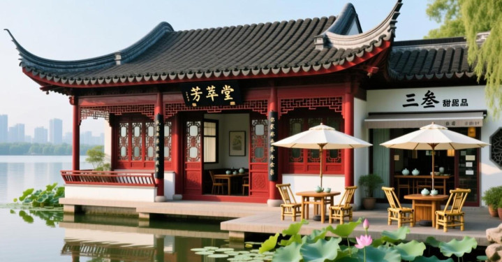 真钱三公 青瓦飞檐的收用古建 朱红雕花门窗映着一池荷影