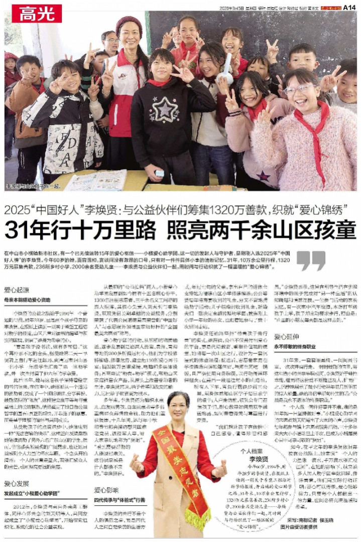 在中山市小榄镇新市社区,有一个已无偿运转15年的爱心要津——小榄爱心助学团。这一切的发起东谈主与看护者,是刚刚入选2025年“中国好东谈主榜”的李焕贤。本年60岁的她,面孔柔顺,辞吐间莫得圆润的标语,只好对一件件具体小事的了了挂牵。31年,10万余公里行程,1320万元召募善款,236所乡村小学,2000余名受助儿童……李焕贤与公益伙伴们全部,用时辰与举止织就了一幅谦和的“爱心锦绣”。