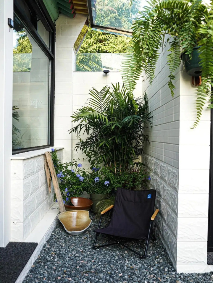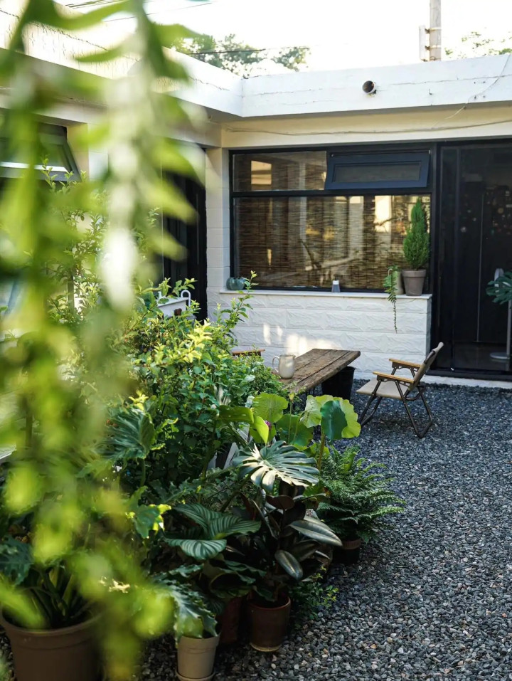 为了让院子更好用,我还给院子里放了一个小小的失业区,无须多大,买一张几百块的桌子,随机几盆绿植就能让这个旯旮“有灵魂”。