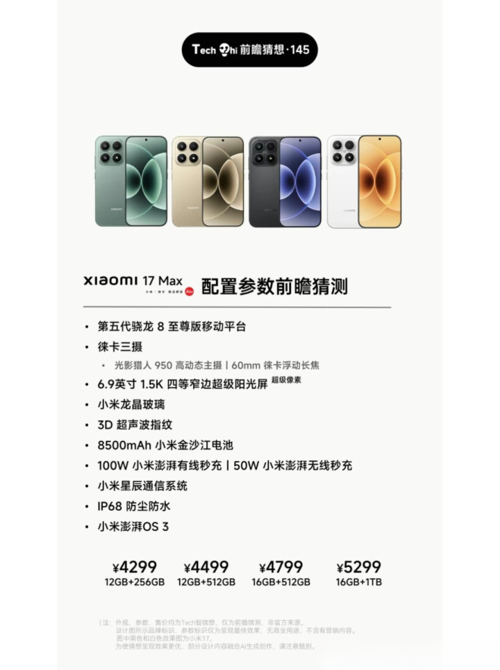 详尽来看,小米17 Max的定位十分明晰,等于对准大屏、长续航需求的用户,扫数成就齐围绕“实用”伸开,莫得弥散的花哨功能。按照爆料的4月发布技能,再连合小米一贯的性价比计策,这款新机值得大屏党要点海涵。