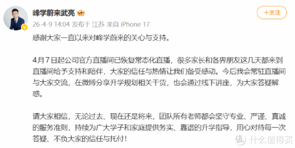 武亮的身份并非外界测度的网红师法者,而是苏州峰学改日素养科技有限公司总司理,看成张雪峰最信任的初创职工,张雪峰生前曾公开表态,武亮能替学生扛事、替我方扛事,更是录用改日的中枢伙伴。在团队停播 13 天后,4 月 7 日武亮镇守官方账号复播,从早上 7 点直播至中午 12 点,全程连麦解答家长疑问,不息张雪峰以往的直播节拍,这场直播累计不雅看东谈主次阻抑 600 万,在线峰值达到 13 万东谈主,后续常态化直播单场不雅看量也超 360 万,账号短短 7 天涨粉超 76 万,足以见得阛阓对这份传承的招供
