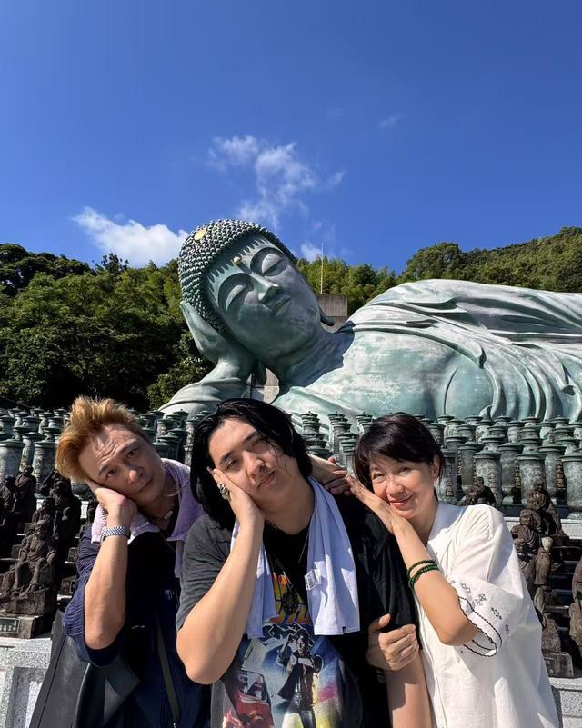 下图挽着吴费曼胳背戴白色棒球帽的应该是他的姆妈——王丽萍。她曾是模特、演员,90 年代出演过《旷世双骄》《多情全国》等影视剧,2001 年与吴镇宇成亲淡出文娱圈,专注家庭。