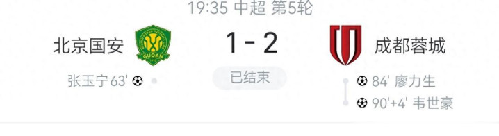 北京时辰2026年4月12日晚,中超第5轮迎来一场焦点对决。在北京工东谈主通顺场,北京国安镇守主场迎战联赛领头羊成齐蓉城。最终,凭借廖力生和补时阶段韦世豪的进球,成齐蓉城以2-1逆转驯顺北京国安,在积分榜上暂列榜首。